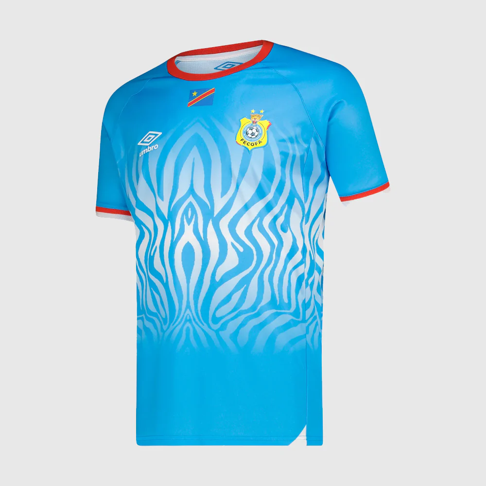 Worn proudly by the Leopards on home soil, the DR Congo 25/26 Home Elite Jersey brings together performance design and national identity. Made from micro interlocking jacquard fabric with a 140gsm sublimated finish, it delivers lightweight breathability. Ribbed collar and sleeve cuffs provide structure, finished with a 3D raised FECOFA crest and Umbro logo. 100% polyester.