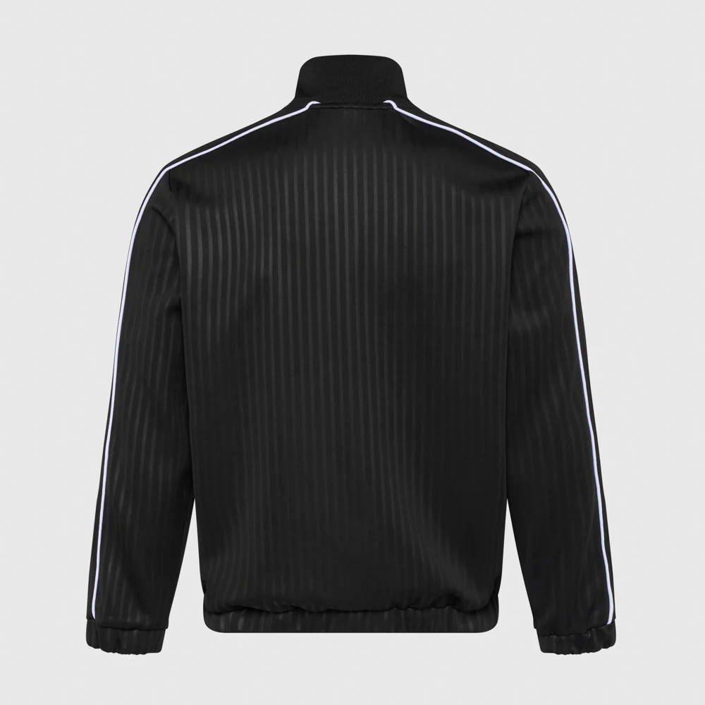 A classic track jacket with a heavier weight fabric for added warmth. Features a vertical pinstripe pattern, contrasting panels, and an embroidered shield badge. Available in navy, black, and green colorways. Includes zippered side pockets and a full zip front. Ideal for sportswear or casual outerwear in cooler weather.