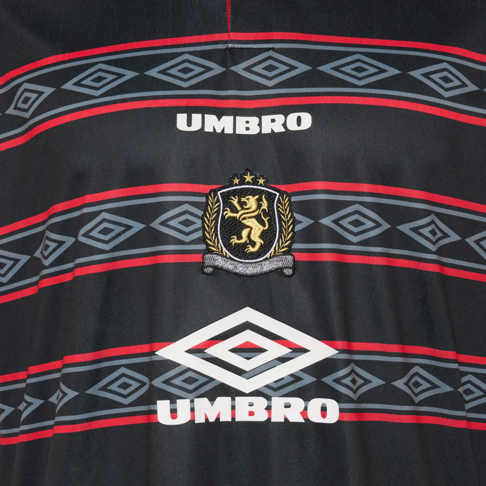 A distinctive polo shirt featuring a bold geometric pattern and horizontal stripes. Available in navy, green, and black/red colorways. Adorned with a unique embroidered crest, adding a touch of distinction. Perfect for casual wear with a touch of sportswear influence.