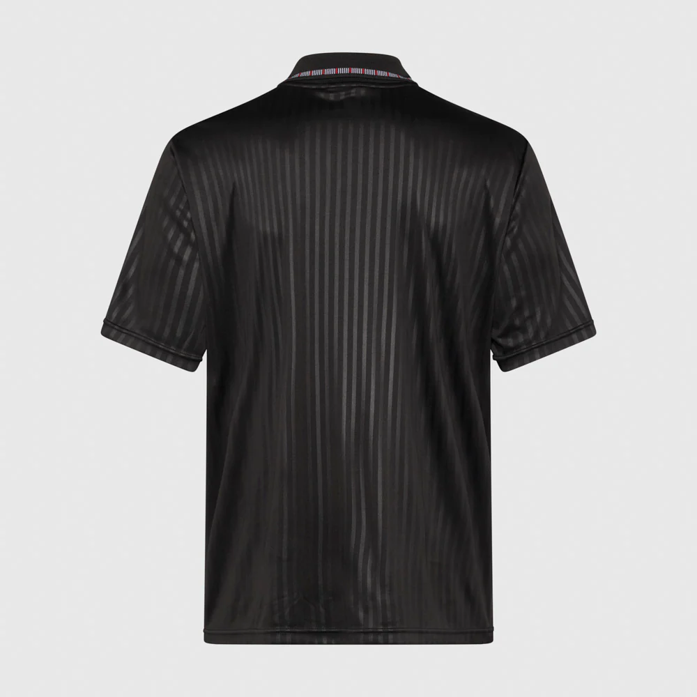 A classic polo shirt featuring a vertical pinstripe pattern and a V-neck collar. Available in navy, black, and green colorways. Features an embroidered chest badge and "Football League" script. Perfect for casual or sportswear-influenced style.