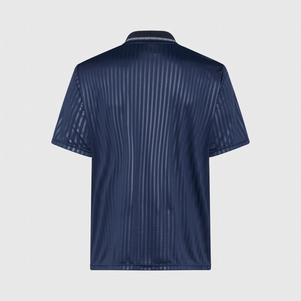A classic polo shirt featuring a vertical pinstripe pattern and a V-neck collar. Available in navy, black, and green colorways. Features an embroidered chest badge and "Football League" script. Perfect for casual or sportswear-influenced style.
