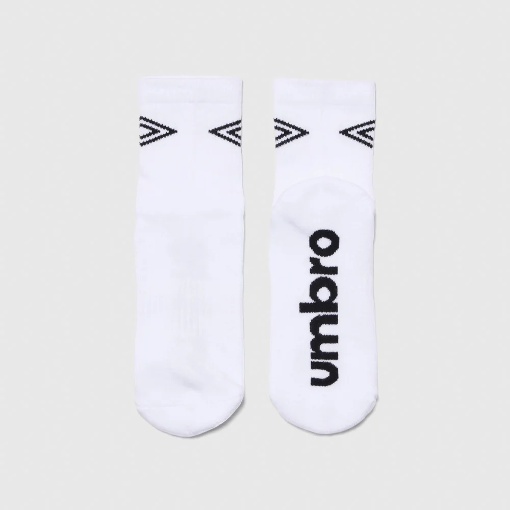 Quarter-length socks in white designed for all-day wear. Made with soft cotton blend and ribbed through the leg, with a mesh-knit background behind the jacquard leg branding. Finished with a terry half foot, contrast Rosso toe seam and jacquard logo on the sole.