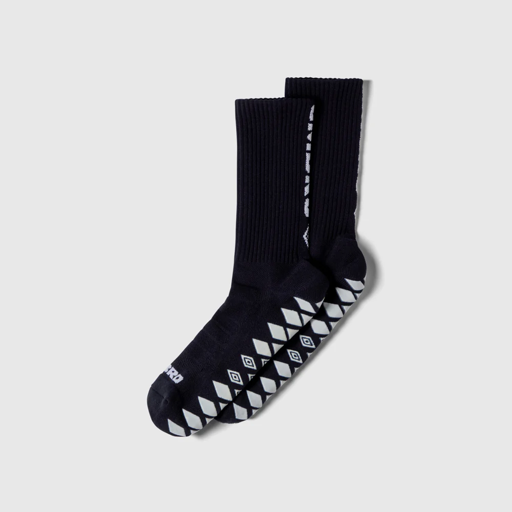 Experience superior comfort and performance with our Umbro Football Grip Socks. Featuring French Terry panels on the top of the foot, which are padded and plentiful, these socks offer enhanced cushioning and support to keep your feet comfortable within your football boots. The socks are incredibly breathable, due to the knitted mesh construction. The heel will provide a snug fit due to the Y-stitch technique, and the flat Rosso toe seam prevents irritation. The toes feel secure and sit nicely within the sock. The essential part of a grip sock is the anti-slip PVC print logo sole. These will grip the innersole of your boots or shoes to keep the socks in place. This will help to prevent excess rubbing or friction, which in turn, will help to reduce to chances of blisters and hot spots when your feet heat up. The knitted Umbro logo on the back and at the edge of the opening adds a touch of style to these essential socks