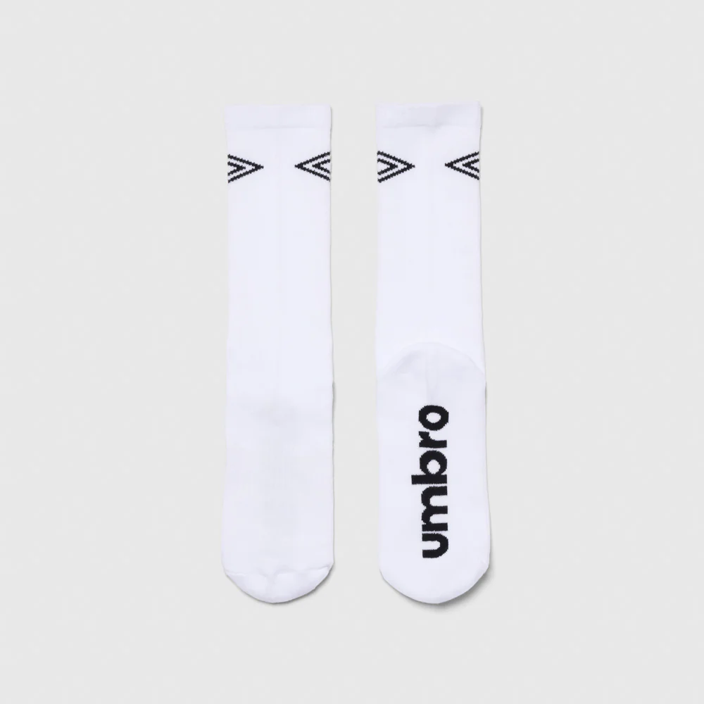 Classic crew socks in white with subtle performance features. Ribbed leg with mesh-backed jacquard branding, cushioned terry half foot, and Y-heel for a close fit. Contrast Rosso toe seam adds a clean finish.
